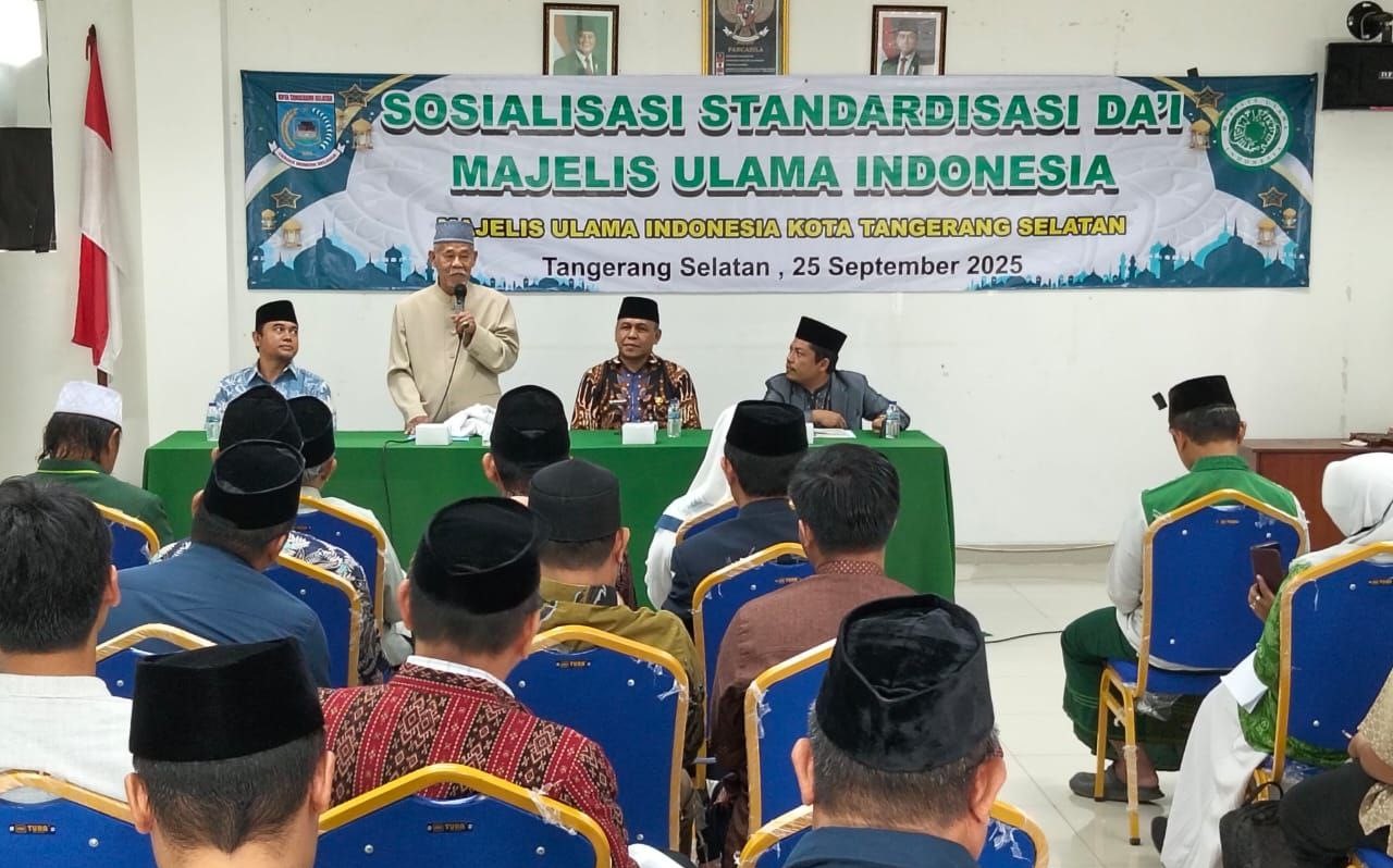Menjadi dai bukan sekadar menyampaikan ceramah, tapi juga soal kesiapan diri, mulai dari ilmu hingga penampilan. Pesan ini kembali ditegaskan Ketua Umum Majelis Ulama Indonesia (MUI) Kota Tangerang Selatan, KH Saidih, saat membuka acara Sosialisasi dan Standarisasi Dai MUI Tangsel di Gedung Kelembagaan, Jalan Siliwangi, Pamulang Barat, Kamis (25/9/2025).